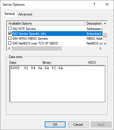 Available Options에서 043 Vender Specific Info에 체크 후 하단에 아래에 따라 입력해야 합니다.