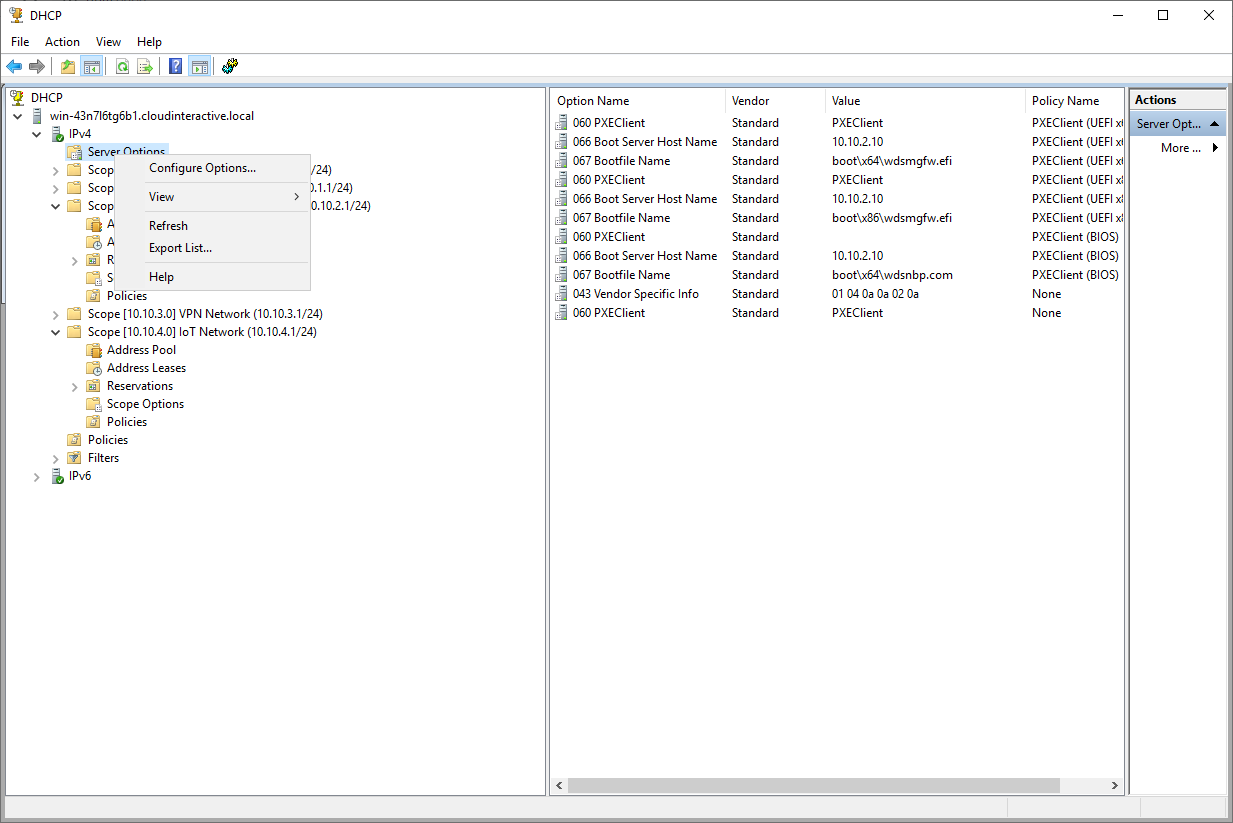 DHCP 서버 관리자를 열어 IPv4 - Server Options 우클릭 후 Configure Options 항목을 클릭합니다.