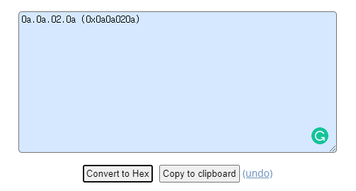 변환 된 값의 앞쪽에 01 04를 추가하여 입력합니다. 필자의 경우 01 04 0A 0A 02 0A가 되겠습니다.