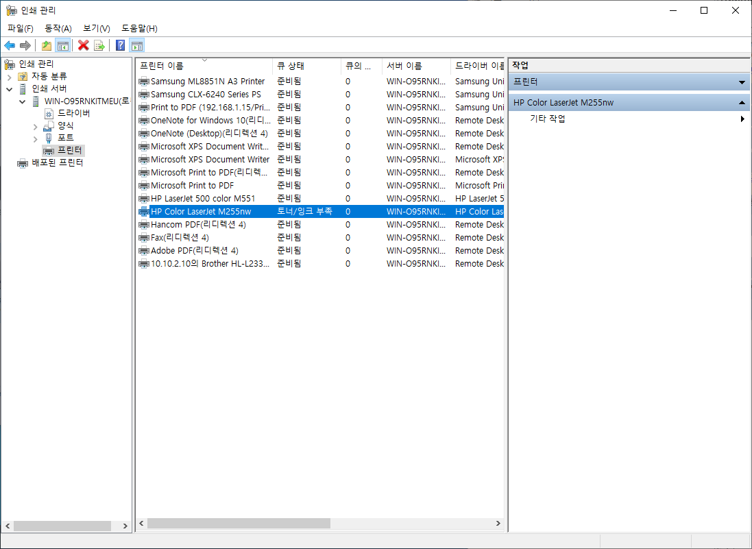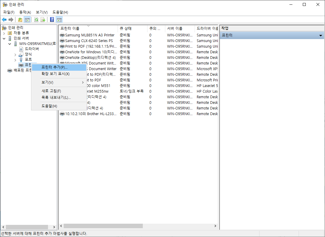 인쇄 관리자에서 배포할 모든 프린터를 추가하세요. 만약 이미 프린터 드라이버를 설치하였다면 프린터란에 해당 프린터가 표시될 것 입니다.
