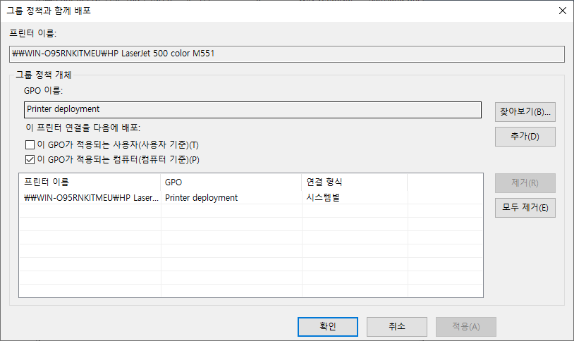 프린터를 배포 할 유저 또는 컴퓨터의 OU에 GPO를 추가하세요.