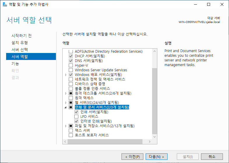 프린터를 배포할 서버에서 인쇄 및 문서 서비스를 추가합니다.