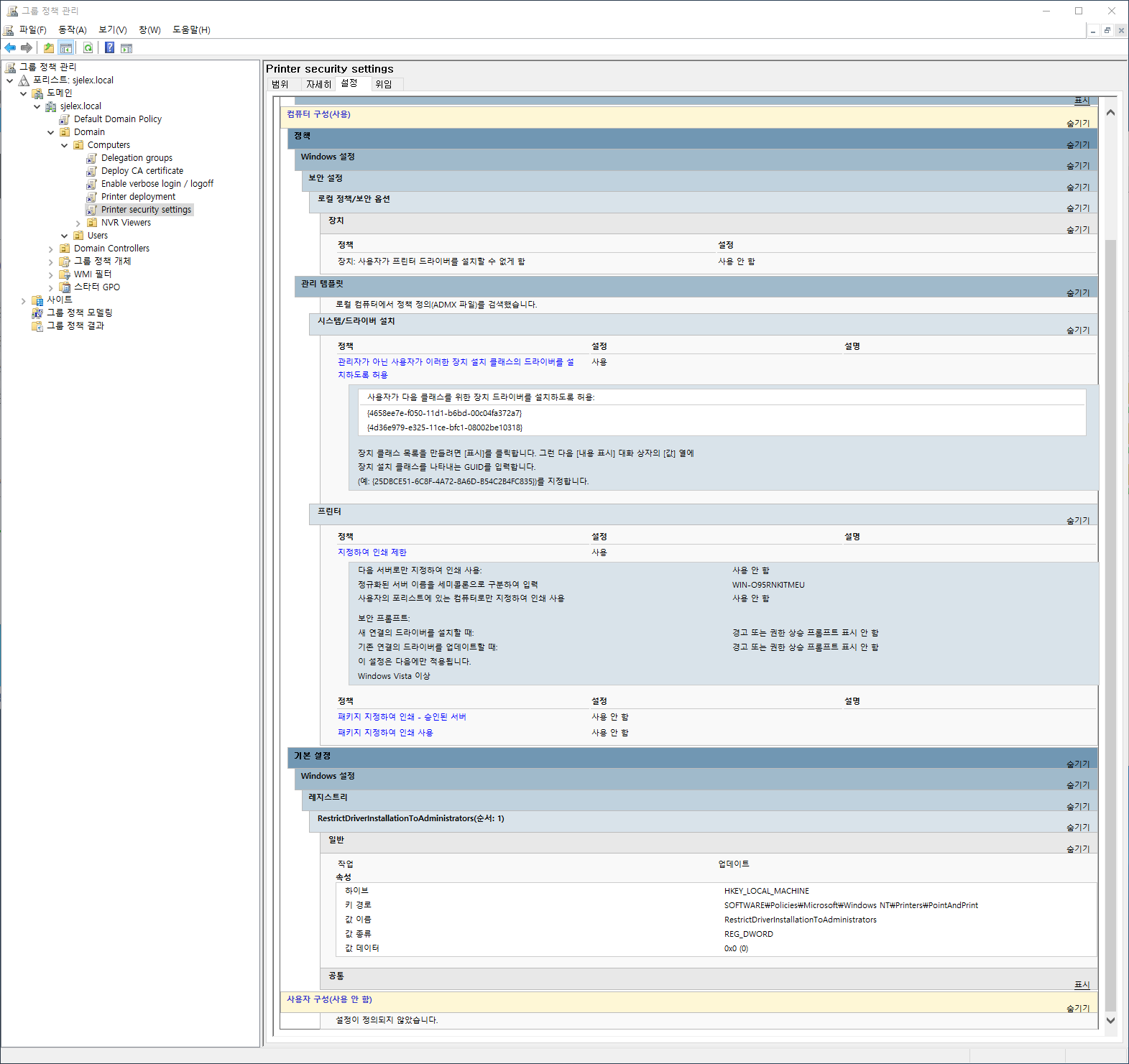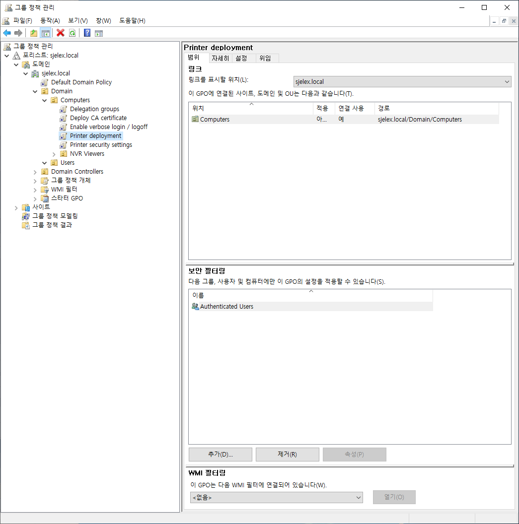만약 부서별로 OU가 나눠져있고, 각 각 다른 프린터 배포 정책으로 프린터가 배포되어 있는 경우, 상위 OU에서 한개의 그룹 정책 개체로 보안 정책을 정의해도 됩니다.
