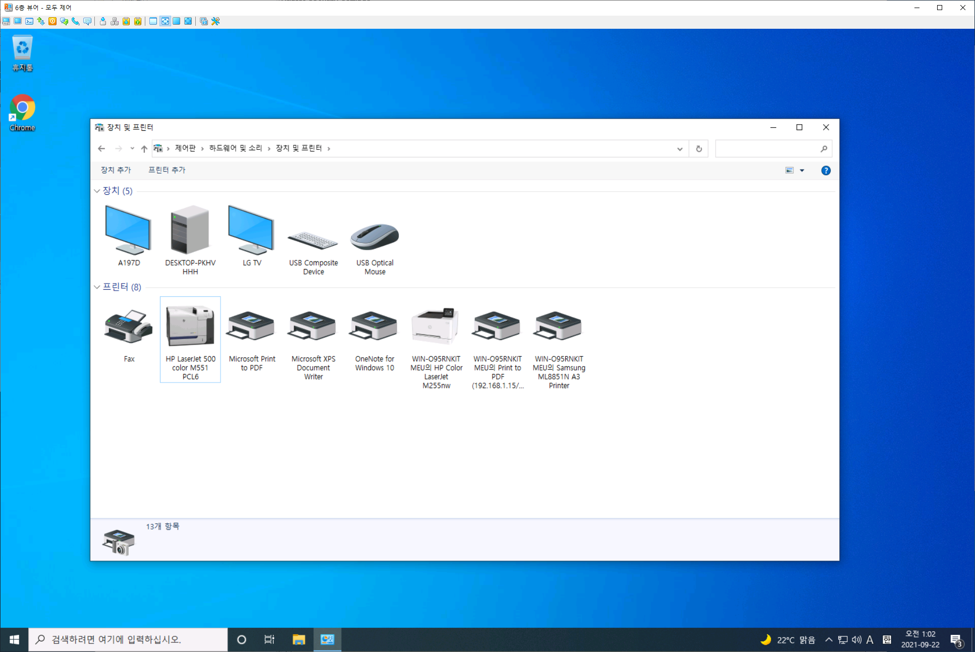 클라이언트가 부팅 된 이후 드라이버를 설치하는데 일정 시간이 소요됩니다. 프린터 드라이버가 모두 설치 될 때 까지 잠시 기다린 후 제어판의 장치 및 프린터에서 배포한 프린터가 표시되는 것을 확인 할 수 있습니다.