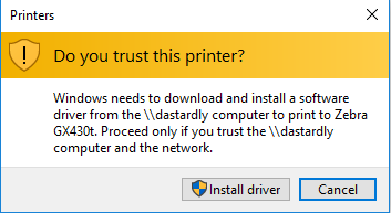 하지만 클라이언트가 최신 버전의 Windows 10을 구동하는 경우, 분명히 정확하게 GPO를 할당하였으나 장치 및 프린터에 배포 한 프린터가 나타나지 않거나, 관리자 권한을 요구하는 경고 창을 띄우는 경우가 있습니다. 이는 최근 KB5005033 (2021-08-10) 업데이트에서 프린터 드라이버 관련 취약점을 수정하기 위해, 프린터 드라이버를 설치할 때에 관리자 권한을 묻도록 정책을 변경하였기 때문입니다.