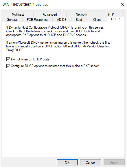 DHCP 항목의 Do not listen on DHCP ports, Configure DHCP options to indicate that is also a PXE Server 항목을 체크합니다.