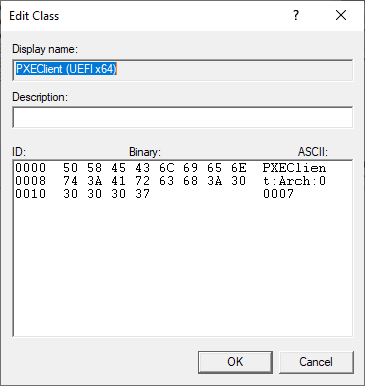 | PXEClient (UEFI x64) | PXEClient:Arch:00007 |