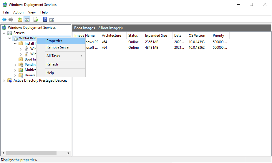Windows Deployment Services 콘솔에서 대상 서버를 우클릭하여 Properties 항목을 클릭합니다.