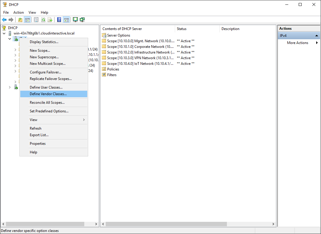 DHCP 콘솔에서 대상 서버를 우클릭하여 Define Vendor Classes 항목을 클릭합니다.