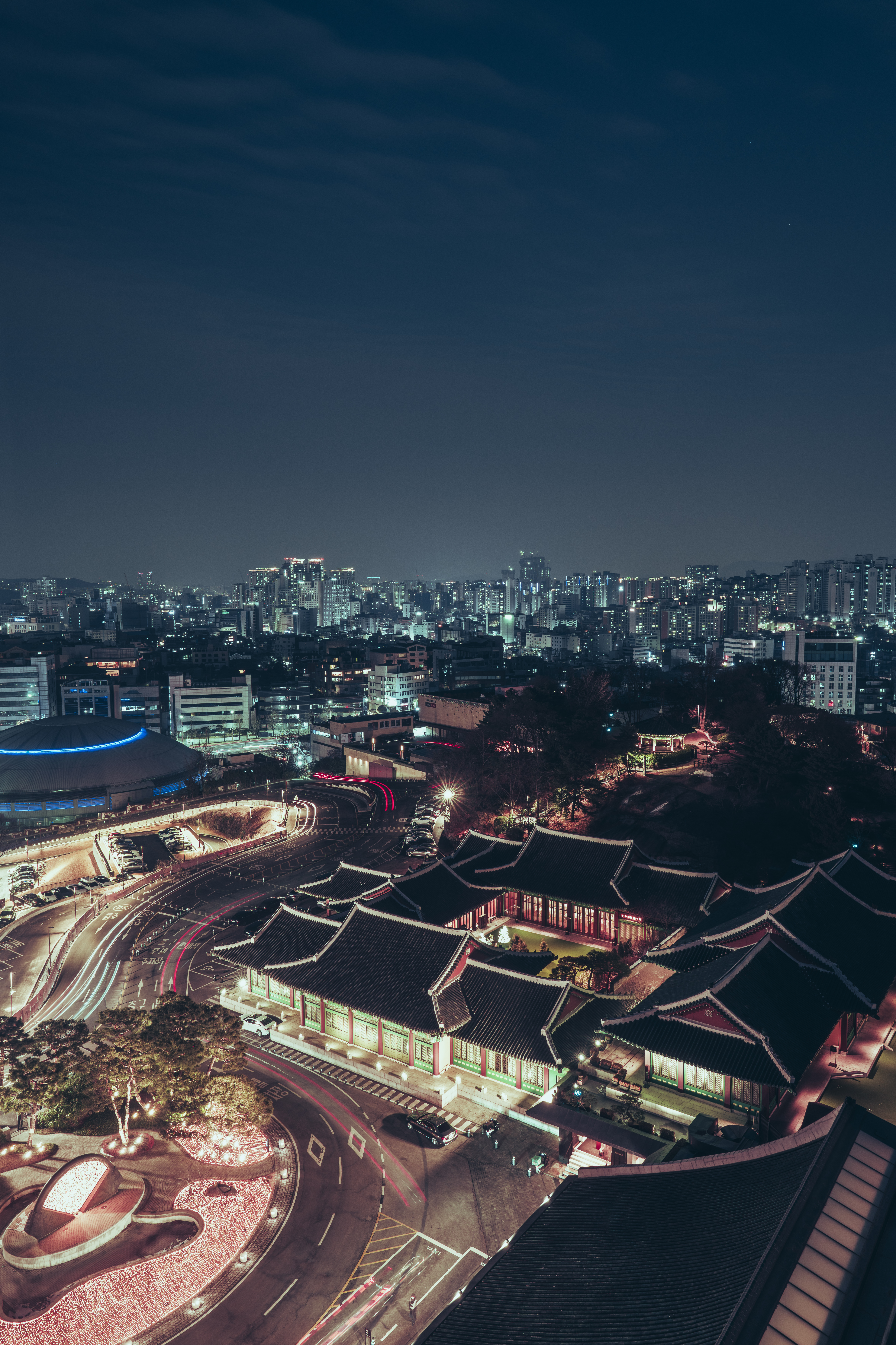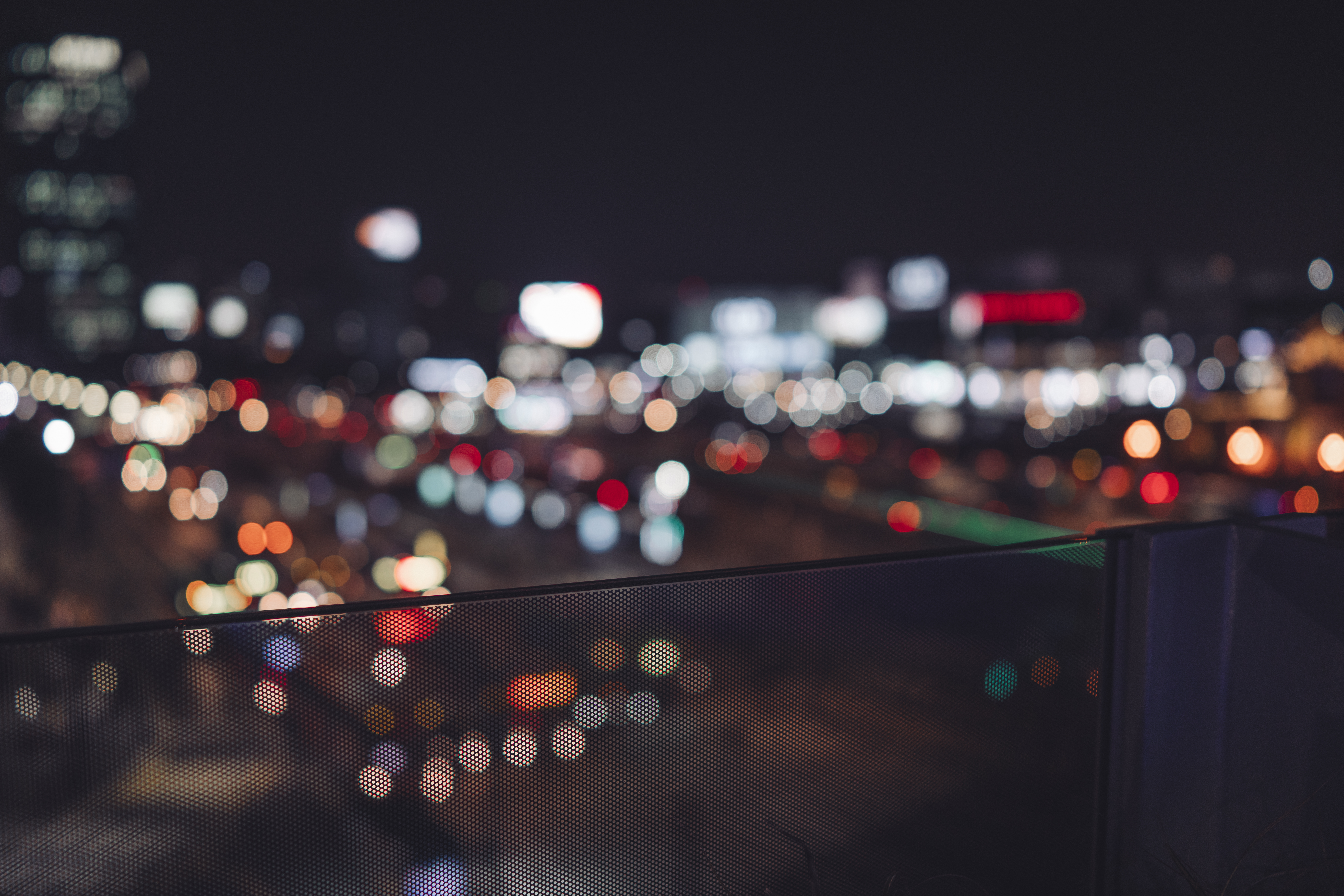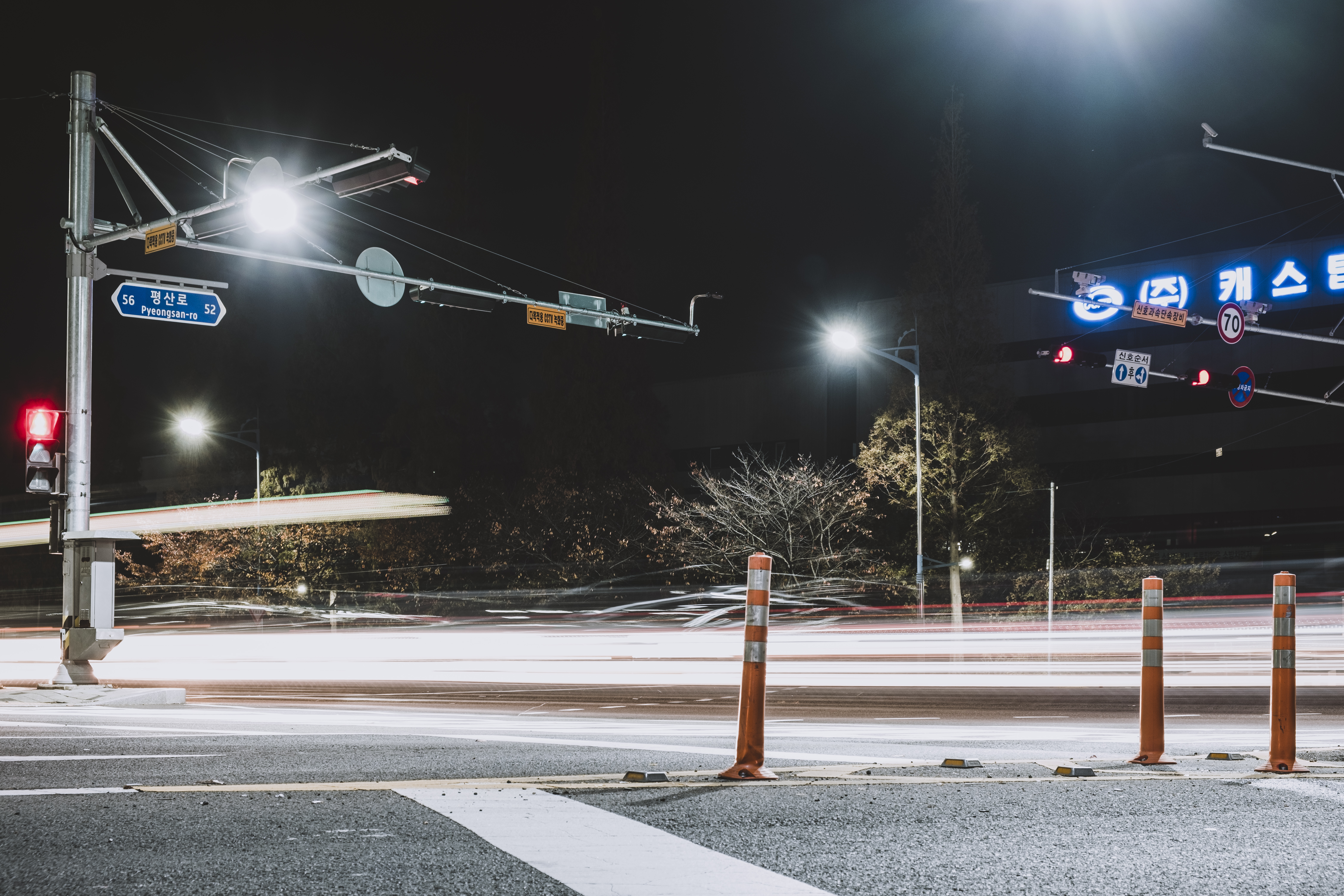 위 사진은 노출을 20초로 설정하고 카메라를 움직이지 않게 삼각대에 고정하고 창밖에 풍경을 찍은 사진입니다. 카메라는 삼각대에 고정되있기 때문에 다른 곳은 흔들리거나 움직이지 않았지만 차는 셔터가 열린 20초 동안 계속해서 움직였기 때문에, 차량의 궤적이 사진에 담겼습니다.