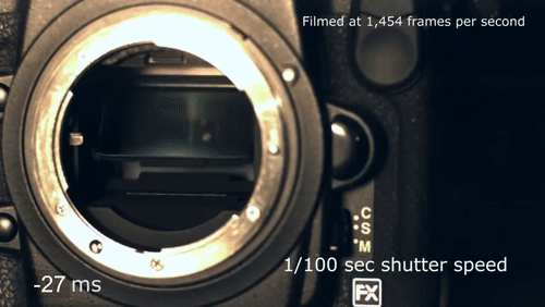 위는 카메라의 셔터가 실제로 동작하는 모습을 슬로우 모션으로 촬영한 장면입니다. 처음에 미러가 올라가고 검은 막이 열린 후 다시 닫히는 모습이 나옵니다. 셔터 속도는 이 검은 막 (셔터)가 열리는 시간을 조절하는 것 입니다.