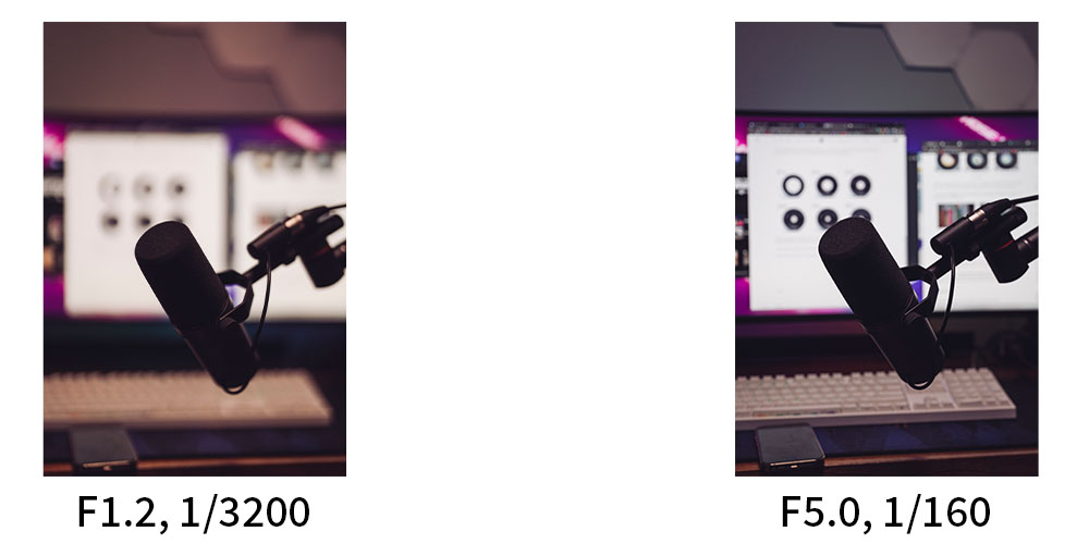위 사진은 똑같은 장면을 같은 ISO로 각 각 F1.2와 F5.0으로 찍은 사진입니다. 똑같이 마이크 중앙에 촛점을 맞추었지만, 조리개를 조은 것보다 푼것이 훨씬 배경이 흐려보이는 것이 보입니다.