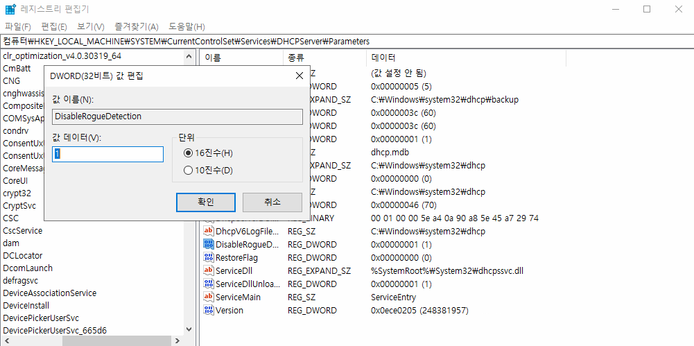REG_DWORD DisableRogueDetection 값을 추가하고 값 데이터를 1로 설정합니다.