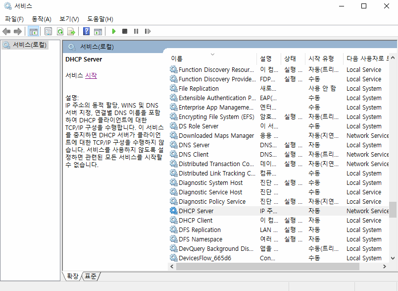 service.msc에서 DHCP Server 서비스가 꺼져있는 것을 확인하고 다시 시작하려 했으나 시작하는 순간 다시 정지되어
