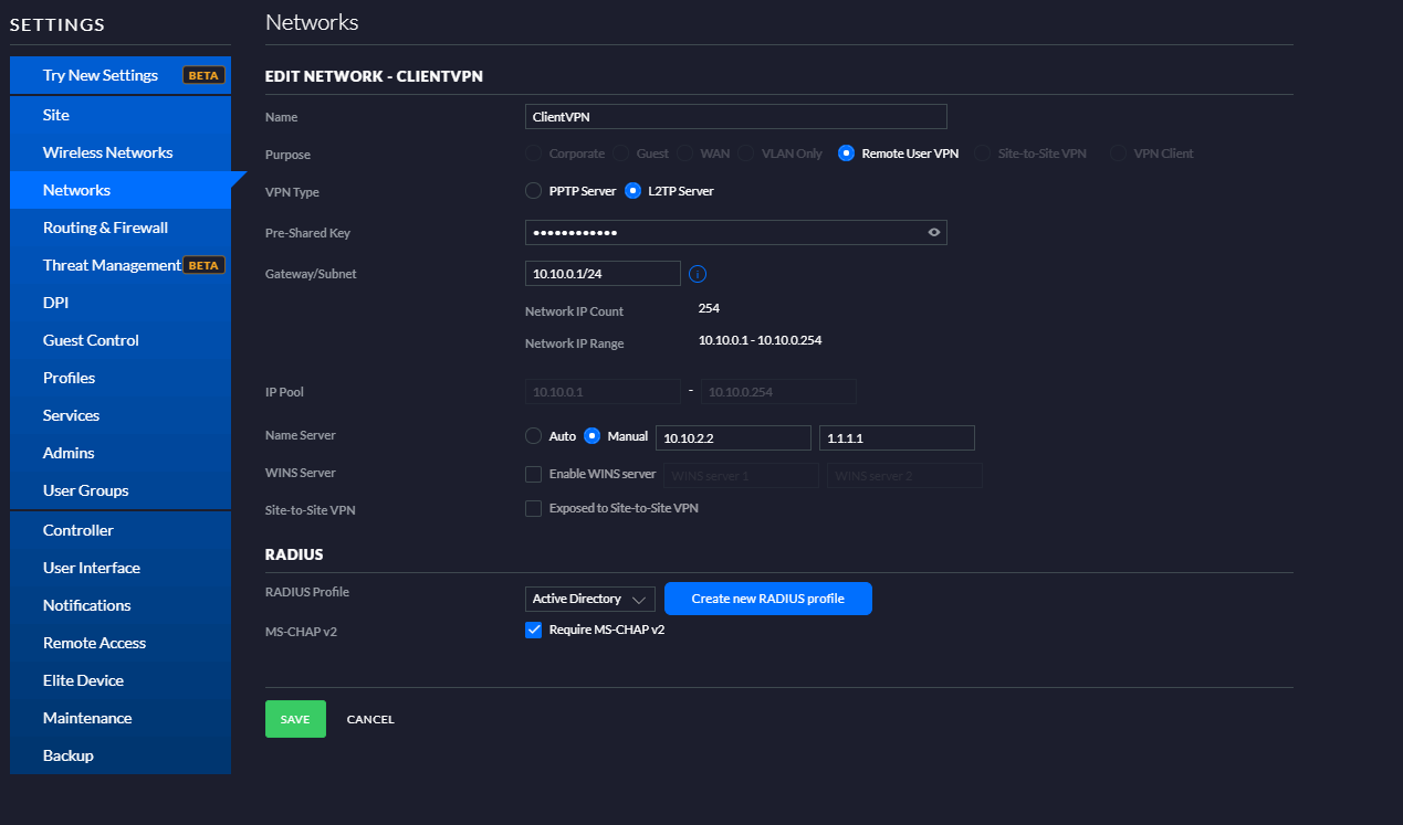 반드시 Ubiquiti사의 게이트웨이가 필요합니다. 또한 L2TP VPN은 구성하기 전에 RADIUS 서버를 먼저 구성해야 합니다.