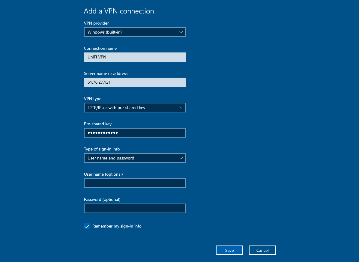 - Pre-shared key - 위에서 L2TP 서버를 구성할 때 적은 Pre-shared key를 적습니다.